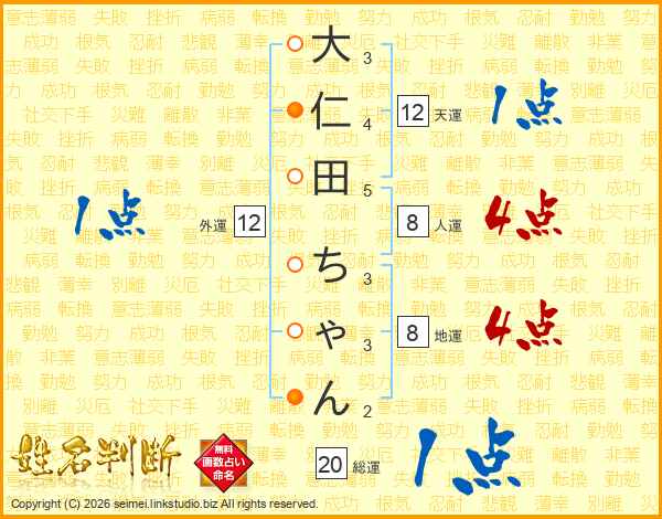 大(3画)仁(4画)田(5画) ち(3画)ゃ(3画)ん(2画)