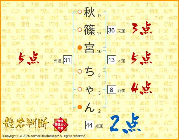 秋(9画)篠(17画)宮(10画) ち(3画)ゃ(3画)ん(2画)