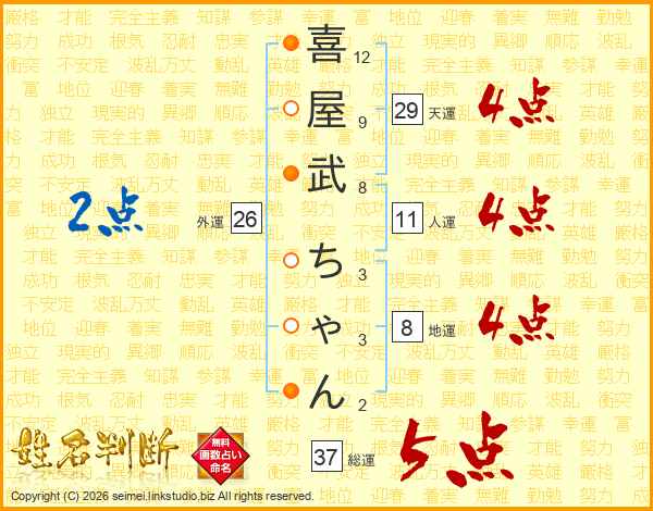 喜(12画)屋(9画)武(8画) ち(3画)ゃ(3画)ん(2画)