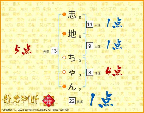 忠(8画)地(6画) ち(3画)ゃ(3画)ん(2画)