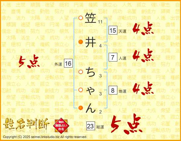 笠(11画)井(4画) ち(3画)ゃ(3画)ん(2画)