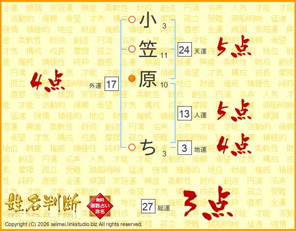生活面を象徴する運勢です。外部から受ける影響力を表し、結婚運、家庭運や職場、環境への順応性を表します。総運から人運を引いた画数。姓や名が1文字の場合を除く。