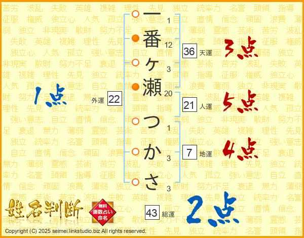 一番ヶ瀬つかささんの総運は43画の2点!