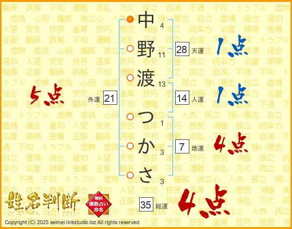 生活面を象徴する運勢です。外部から受ける影響力を表し、結婚運、家庭運や職場、環境への順応性を表します。総運から人運を引いた画数。姓や名が1文字の場合を除く。