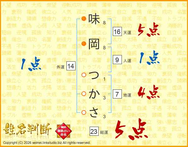 味岡つかささんの総運は23画の5点!