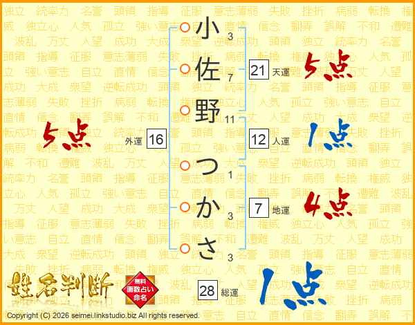 生活面を象徴する運勢です。外部から受ける影響力を表し、結婚運、家庭運や職場、環境への順応性を表します。総運から人運を引いた画数。姓や名が1文字の場合を除く。