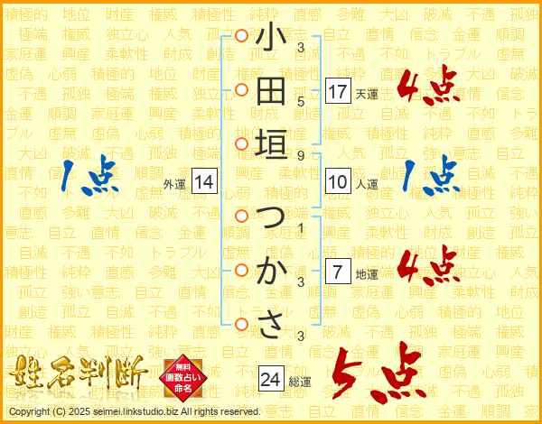 小(3画)田(5画)垣(9画) つ(1画)か(3画)さ(3画)