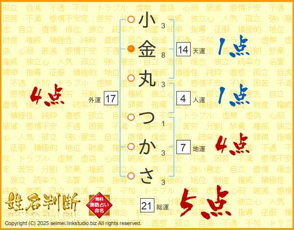 小(3画)金(8画)丸(3画) つ(1画)か(3画)さ(3画)