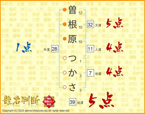 曽(12画)根(10画)原(10画) つ(1画)か(3画)さ(3画)