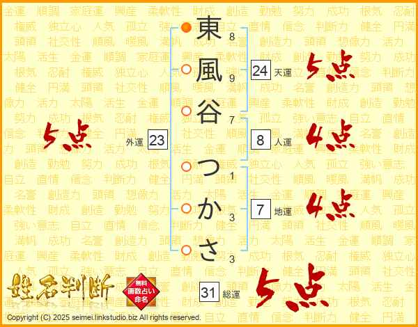 東(8画)風(9画)谷(7画) つ(1画)か(3画)さ(3画)