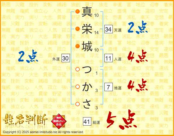 真(10画)栄(14画)城(10画) つ(1画)か(3画)さ(3画)