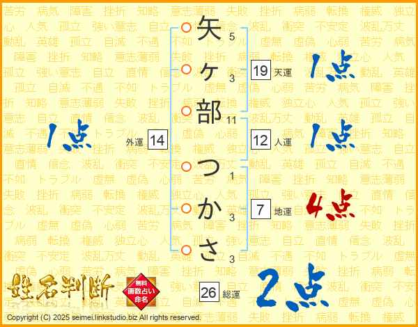 矢(5画)ヶ(3画)部(11画) つ(1画)か(3画)さ(3画)