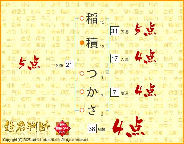 稲(15画)積(16画) つ(1画)か(3画)さ(3画)