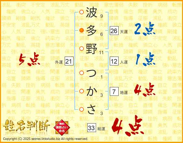 生活面を象徴する運勢です。外部から受ける影響力を表し、結婚運、家庭運や職場、環境への順応性を表します。総運から人運を引いた画数。姓や名が1文字の場合を除く。