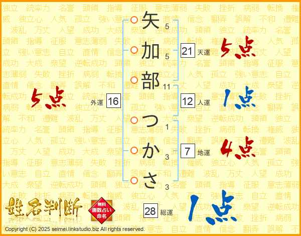 矢(5画)加(5画)部(11画) つ(1画)か(3画)さ(3画)