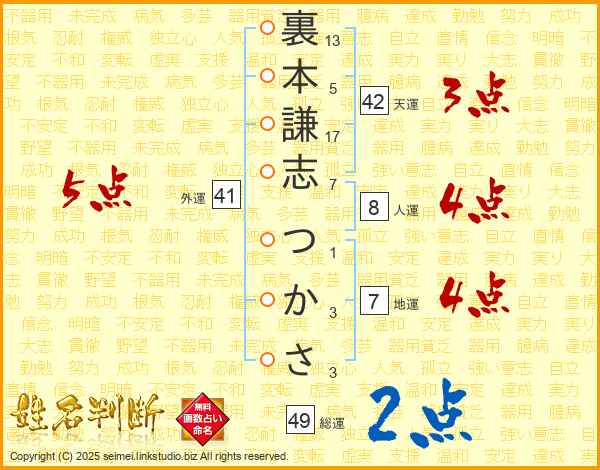 裏本謙志つかささんの総運は49画の2点!