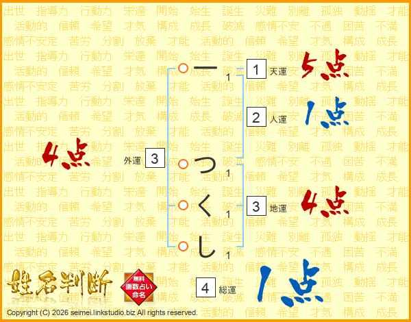 生活面を象徴する運勢です。外部から受ける影響力を表し、結婚運、家庭運や職場、環境への順応性を表します。総運から人運を引いた画数。姓や名が1文字の場合を除く。