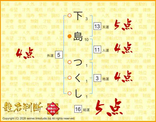 あなたの人生を表す1番重要な運勢です。生涯を通じて影響する総合運となり、主に50歳以降の晩年期に影響を及ぼします。苗字と名前の合計画数。