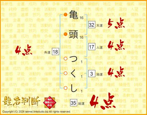 亀頭つくしさんの総運は35画の4点!