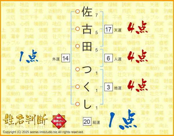 佐古田つくしさんの総運は20画の1点!