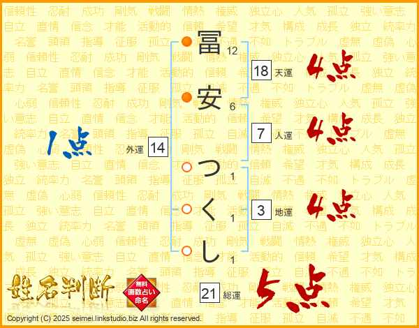 生活面を象徴する運勢です。外部から受ける影響力を表し、結婚運、家庭運や職場、環境への順応性を表します。総運から人運を引いた画数。姓や名が1文字の場合を除く。