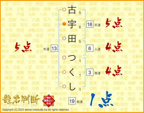 古(5画)宇(6画)田(5画) つ(1画)く(1画)し(1画)