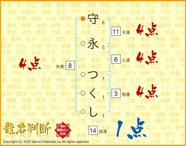 生活面を象徴する運勢です。外部から受ける影響力を表し、結婚運、家庭運や職場、環境への順応性を表します。総運から人運を引いた画数。姓や名が1文字の場合を除く。