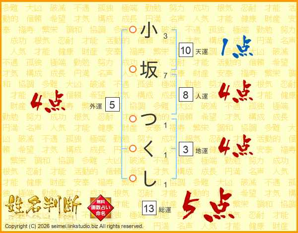 生活面を象徴する運勢です。外部から受ける影響力を表し、結婚運、家庭運や職場、環境への順応性を表します。総運から人運を引いた画数。姓や名が1文字の場合を除く。