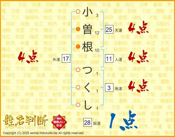 小(3画)曽(12画)根(10画) つ(1画)く(1画)し(1画)