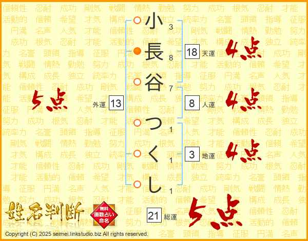 小長谷つくしさんの総運は21画の5点!