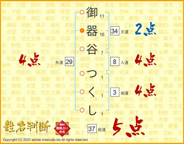 御(11画)器(16画)谷(7画) つ(1画)く(1画)し(1画)