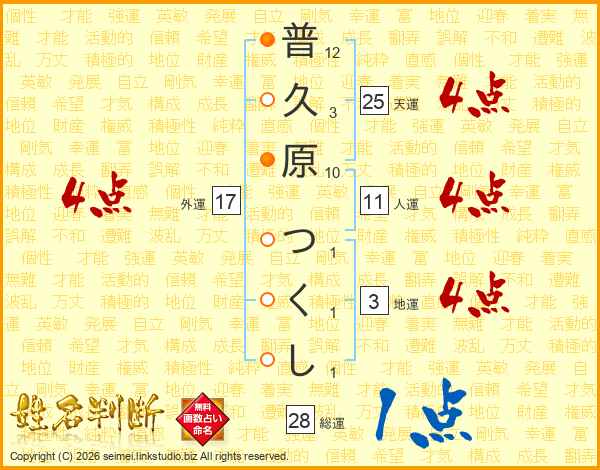 生活面を象徴する運勢です。外部から受ける影響力を表し、結婚運、家庭運や職場、環境への順応性を表します。総運から人運を引いた画数。姓や名が1文字の場合を除く。