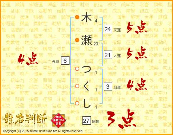 木(4画)瀬(20画) つ(1画)く(1画)し(1画)