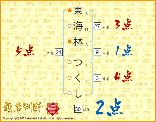 東(8画)海(11画)林(8画) つ(1画)く(1画)し(1画)