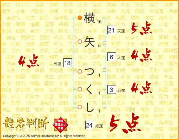 横(16画)矢(5画) つ(1画)く(1画)し(1画)