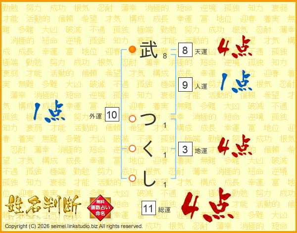 生活面を象徴する運勢です。外部から受ける影響力を表し、結婚運、家庭運や職場、環境への順応性を表します。総運から人運を引いた画数。姓や名が1文字の場合を除く。