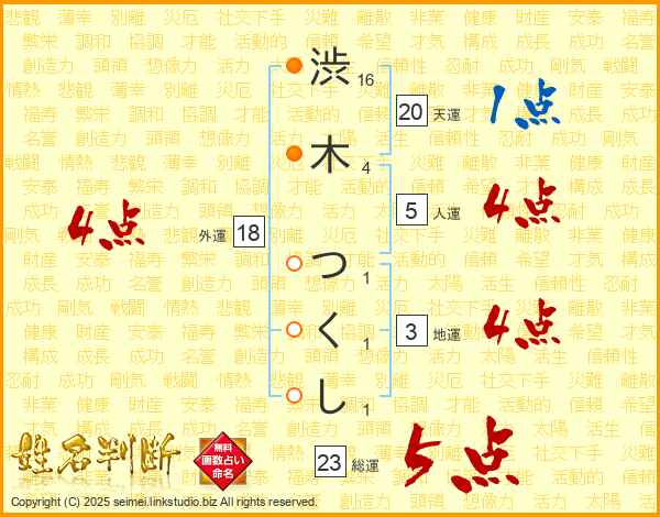 渋(16画)木(4画) つ(1画)く(1画)し(1画)