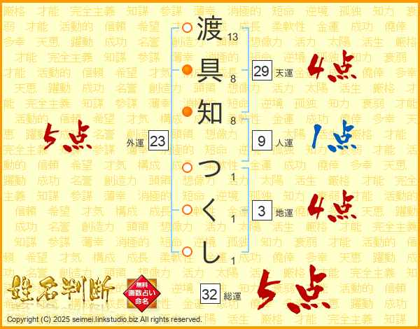 渡具知つくしさんの総運は32画の5点!