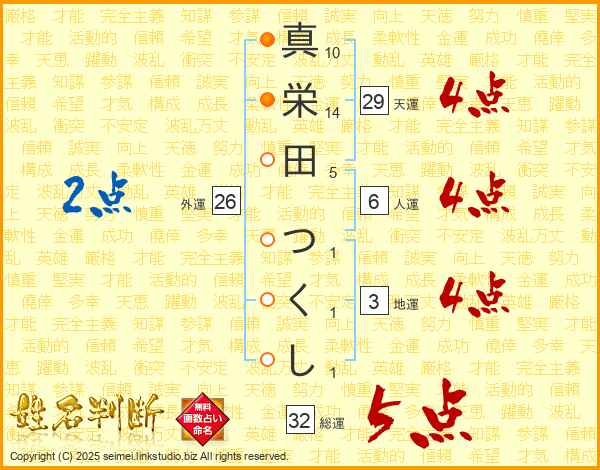 生活面を象徴する運勢です。外部から受ける影響力を表し、結婚運、家庭運や職場、環境への順応性を表します。総運から人運を引いた画数。姓や名が1文字の場合を除く。