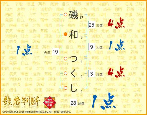 生活面を象徴する運勢です。外部から受ける影響力を表し、結婚運、家庭運や職場、環境への順応性を表します。総運から人運を引いた画数。姓や名が1文字の場合を除く。