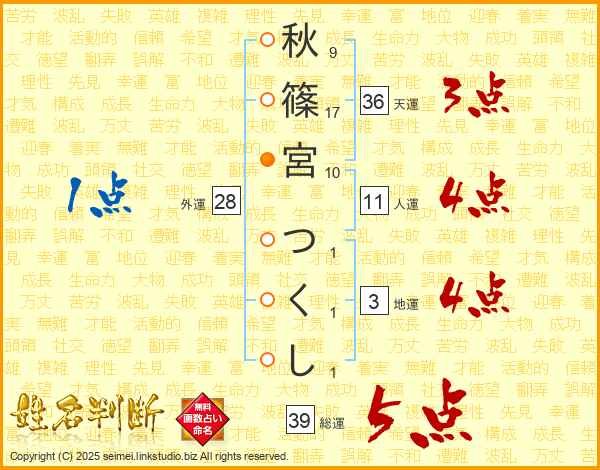 生活面を象徴する運勢です。外部から受ける影響力を表し、結婚運、家庭運や職場、環境への順応性を表します。総運から人運を引いた画数。姓や名が1文字の場合を除く。