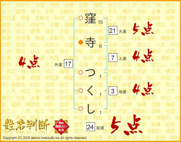 生活面を象徴する運勢です。外部から受ける影響力を表し、結婚運、家庭運や職場、環境への順応性を表します。総運から人運を引いた画数。姓や名が1文字の場合を除く。