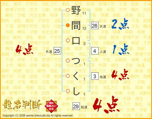 野間口つくしさんの総運は29画の4点!
