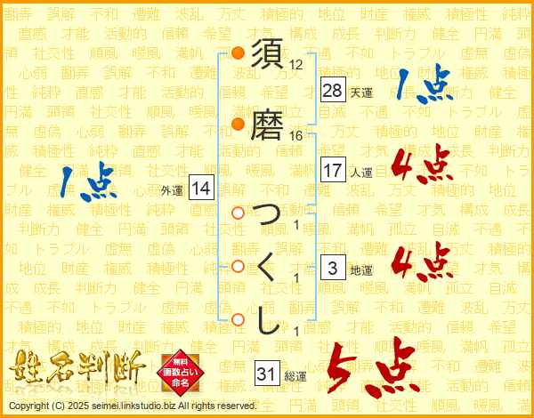 須(12画)磨(16画) つ(1画)く(1画)し(1画)
