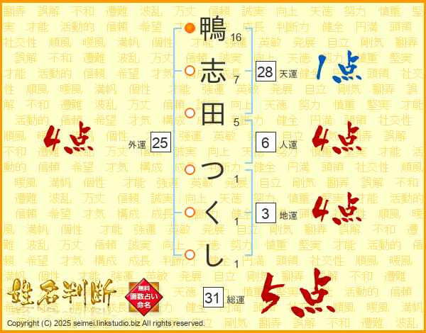 鴨(16画)志(7画)田(5画) つ(1画)く(1画)し(1画)