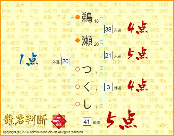 鵜瀬つくしさんの天運は38画の4点!