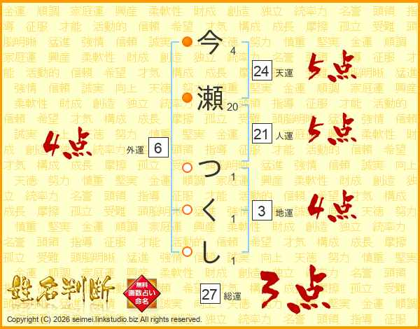 今(4画)瀬(20画) つ(1画)く(1画)し(1画)