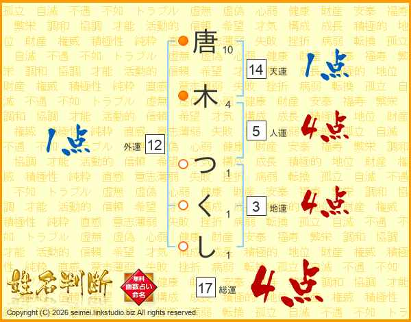 唐(10画)木(4画) つ(1画)く(1画)し(1画)