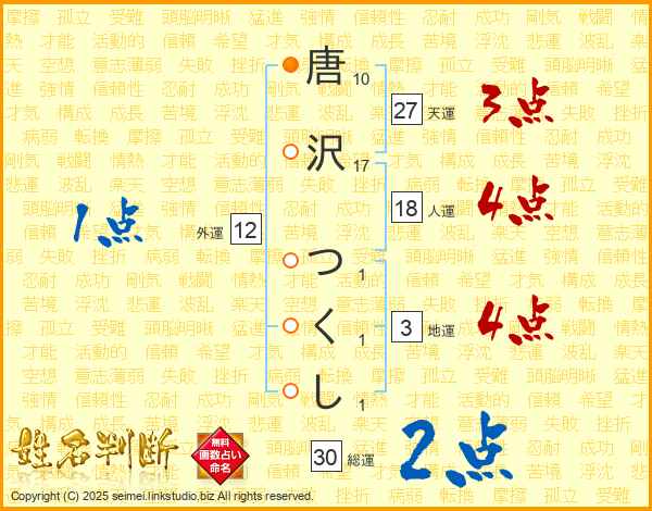 唐(10画)沢(17画) つ(1画)く(1画)し(1画)