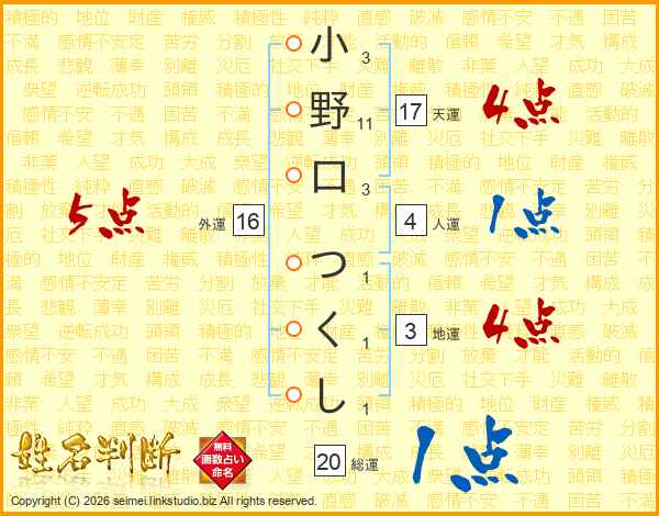 生活面を象徴する運勢です。外部から受ける影響力を表し、結婚運、家庭運や職場、環境への順応性を表します。総運から人運を引いた画数。姓や名が1文字の場合を除く。